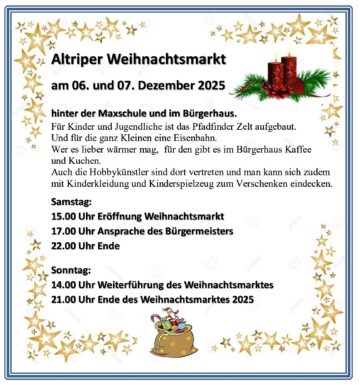 Allgemein [Amtlicher Beitrag] Altriper Weihnachtsmarkt vom 06. bis 07. Dezember 2025 VGV Rheinauen Posted on 04. Dez 202504. Dez 2025