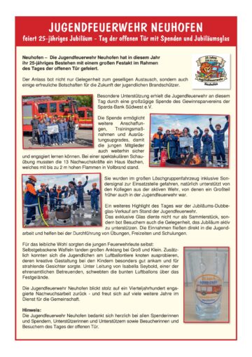 Amtliche Meldung Feuerwehr Neuhofen 25jähriges Jubiläum der Jugendfeuerwehr Neuhofen VGV Rheinauen Posted on 06. Okt 2025 Der Beitrag steht unter Einhaltung der Bildrechte von Dritten zur freien Verfügung.
