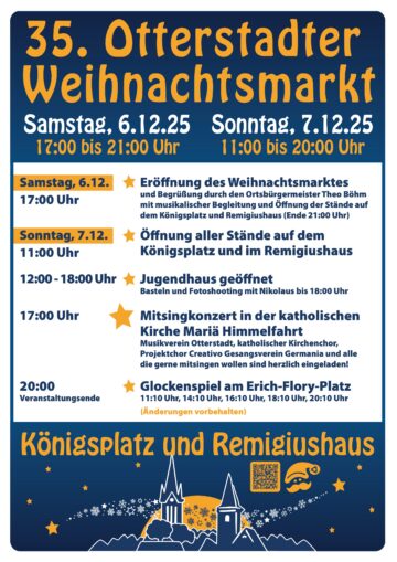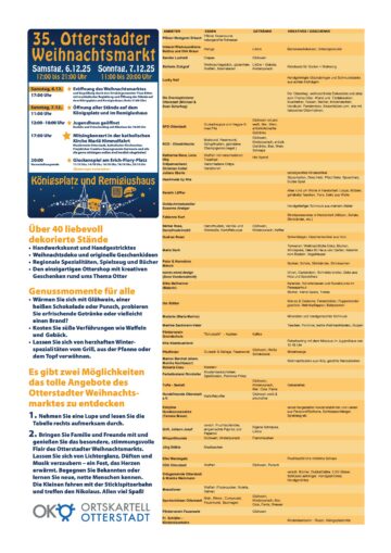 Amtliche Meldung OG Otterstadt Otterstadt 35. Otterstadter Weihnachtsmarkt vom 06.12. bis 07.12.2025 VGV Rheinauen Posted on 24. Nov 2025 https://1000jahre.otterstadt.de/35-otterstadter-weihnachtsmarkt-2025-der-vielleicht-schoenste-weihnachtsmarkt-der-pfalz) Der Beitrag steht unter Einhaltung der Bildrechte von Dritten zur freien Verfügung.