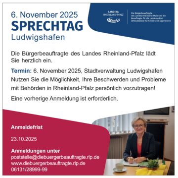 Amtliche Meldung Allgemein Rheinauen, VG Sprechtag der Bürgerbeauftragten des Landes Rheinland-Pfalz und dem Beauftragten für die Landespolizei am 06.11.2025 in der Stadtverwaltung Ludwigshafen VGV Rheinauen Posted on 25. Sep 202525. Sep 2025 Der Beitrag steht unter Einhaltung der Bildrechte von Dritten zur freien Verfügung.