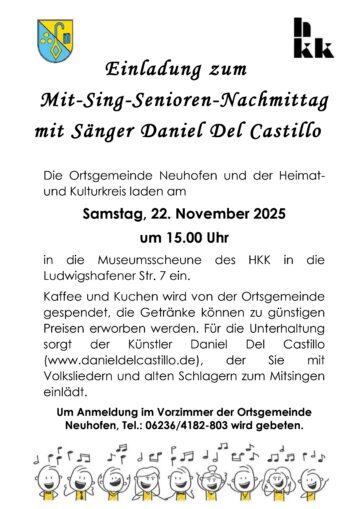 Amtliche Meldung OG Neuhofen Neuhofen Einladung zum Mit-Sing-Senioren-Nachmittag mit Sänger Daniel Del Castillo am Samstag, 22.11.2025, um 15.00 Uhr in Neuhofen VGV Rheinauen Posted on 11. Nov 2025 Der Beitrag steht unter Einhaltung der Bildrechte von Dritten zur freien Verfügung.
