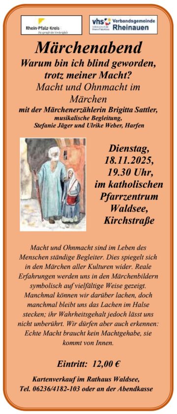 Amtliche Meldung Kultur&Freizeit Rheinauen, VG Märchenabend am Dienstag, 18.11.2025, um 18.30 Uhr, in Waldsee VGV Rheinauen Posted on 16. Okt 2025 Der Beitrag steht unter Einhaltung der Bildrechte von Dritten zur freien Verfügung.