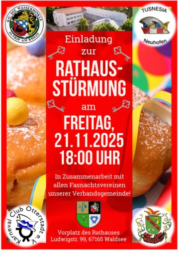 Amtliche Meldung OG Altrip Rheinauen, VG Rathausstürmung am Freitag, 21.11.2025, um 18.00 Uhr in Waldsee VGV Rheinauen Posted on 04. Nov 2025 Der Beitrag steht unter Einhaltung der Bildrechte von Dritten zur freien Verfügung.