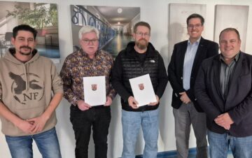 Bildunterschrift: v. l. Ortsbürgermeister Volker Mansky, Schiedsmann Peter Aures, Schiedsmann Andreas Scheifl, Amtsgerichtsdirektor Daniel Kühner, Bürgermeister Patrick Fassott