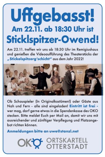 Amtliche Meldung OG Otterstadt Otterstadt Stickelspitzer-Owend am 22.11.2025, ab 18.30 Uhr, im Remigiushaus in Otterstadt VGV Rheinauen Posted on 11. Nov 2025 Der Beitrag steht unter Einhaltung der Bildrechte von Dritten zur freien Verfügung.