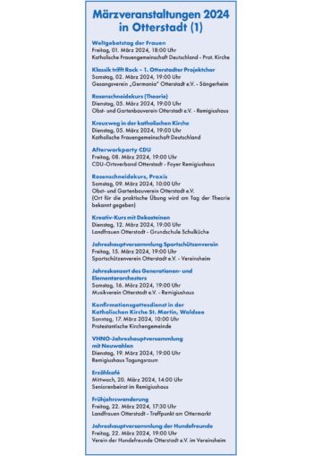 OG Otterstadt [Amtlicher Beitrag] Veranstaltungen im März 2024 VGV Rheinauen Posted on 28. Feb 202423. Feb 2024