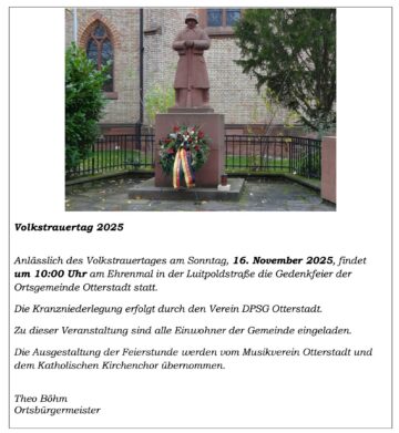 Volkstrauertag am 16.11.2025, um 10.00 Uhr, in der Luitpoldstraße in Otterstadt
