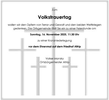 Amtliche Meldung OG Altrip Altrip Volkstrauertag am 16.11.2025, um 11.30 Uhr, auf dem Friedhof in Altrip VGV Rheinauen Posted on 30. Okt 202530. Okt 2025 Der Beitrag steht unter Einhaltung der Bildrechte von Dritten zur freien Verfügung.