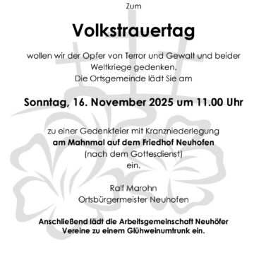 Amtliche Meldung OG Neuhofen Neuhofen Volkstrauertag am 16.11.2025, um 11.00 Uhr, auf dem Friedhof in Neuhofen VGV Rheinauen Posted on 04. Nov 202504. Nov 2025 Der Beitrag steht unter Einhaltung der Bildrechte von Dritten zur freien Verfügung.