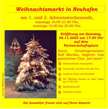 Amtliche Meldung OG Neuhofen Neuhofen Weihnachtsmarkt in Neuhofen am 1. und 2. Adventswochenende in Neuhofen VGV Rheinauen Posted on 24. Nov 2025 Der Beitrag steht unter Einhaltung der Bildrechte von Dritten zur freien Verfügung.