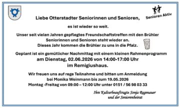 OG Otterstadt [Amtlicher Beitrag] Einladung zum Freundschaftstreffen mit Brühler Seniorinnen und Senioren am 02.06.2026, um 14.00 Uhr, im Remigiushaus in Otterstadt VGV Rheinauen Posted on 22. Apr 2026