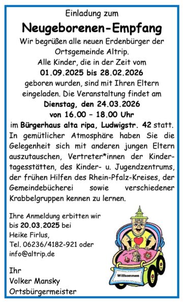 OG Altrip [Amtlicher Beitrag] Einladung zum Neugeborenen-Empfang am Dienstag, 24.03.2026, ab 16.00 Uhr, VGV Rheinauen Posted on 06. Mrz 202606. Mrz 2026
