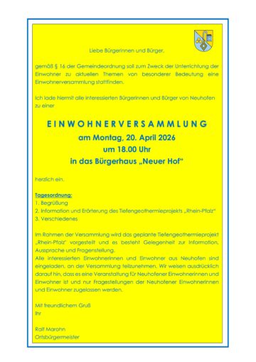 [Amtlicher Beitrag] Einwohnerversammlung am Montag, 20.04.2026, um 18.00 Uhr, im Bürgerhaus „Neuer Hof“