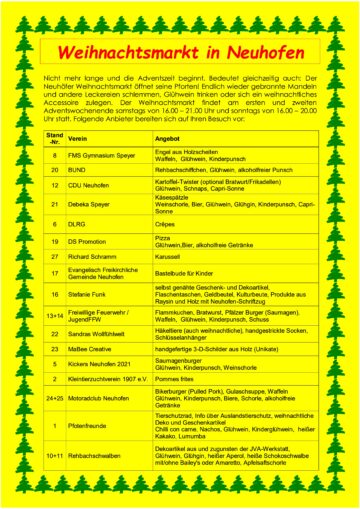 OG Neuhofen Neuhofen [Amtlicher Beitrag] Weihnachtsmarkt in Neuhofen am 1. und 2. Adventswochenende in Neuhofen VGV Rheinauen Posted on 24. Nov 202525. Nov 2025